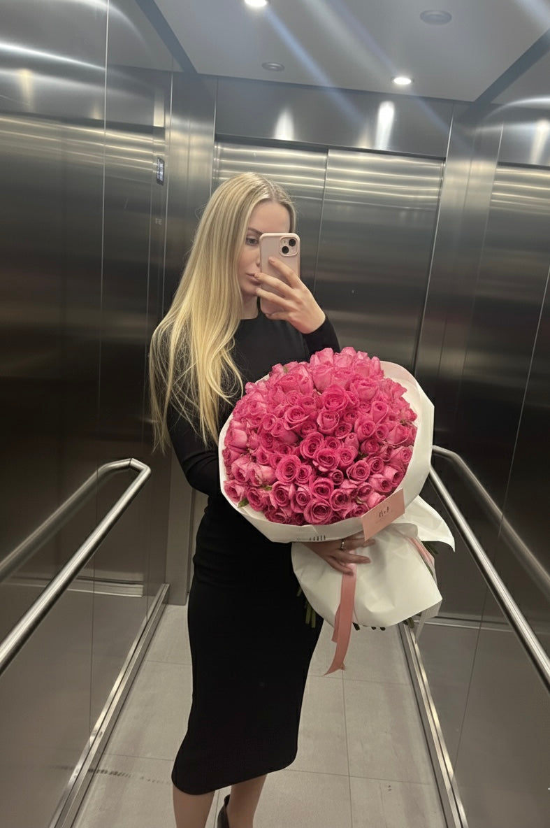 Rose buds can be different - smaller or larger. Our 100 Roses Luxury Bouquet is the ultimate expression of love, admiration, and celebration. Featuring one hundred premium, fresh-cut roses arranged with perfect symmetry and elegant volume, this bouquet delivers a breathtaking impression from the very first glance.